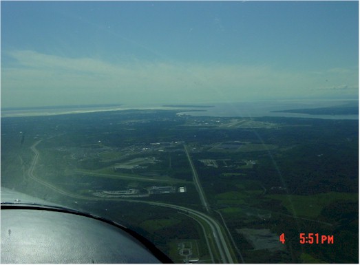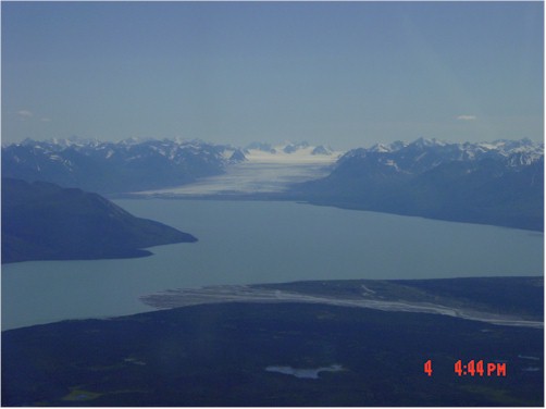 The briefer and pilot reports say the rain is passing and everything to the west is clear all the way to Anchorage. We filed for Northway, Alaska and take off. It is interesting to cross the border from Yukon to Alaska--there is literally a line between the two that you can see from the air! The customs officer was waiting for us at Northway. Said she had been busy due to everyone held up by weather. After some quick fuel, we were off for the two hour and forty minute trip to Anchorage. Passing through the Alaska Range, you become very small. This is a huge range of mountains that is shaped in a semi circle in the south central part of Alaska. McKinley belongs to this range as do numerous peaks above 14,000 ft. This is also glacier country and we passed several on our way to Anchorage. About an two hours out of Anchorage, my tachometer decided that after 3900 hours, it was time to give out. I enjoyed a wonderful loud-pitched squeal for nearly an hour, then clunk and the needle went to zero. I wasn't happy not having a tachometer, but it sure was nice and quiet. We will need to get it fixed before we move on...something for Monday. As we come though the pass and turn south over Palmer, Anchorage and the Knik Arm and Cook Inlet lay out before us. It is good to be in Anchorage again. Our families were waiting for us at Merrill Field--sure good to see them. We hopped in the cars and headed for Wasilla for a 4th of July BBQ with friends. We'll spend the weekend with family and meeting old friends. We'll pick back up on July 8th.