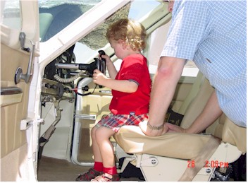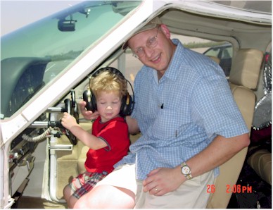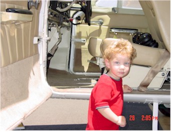 "Carburetor heat--cold." "Master switch--on." "Two strokes of primer." "Throttle in 1/4"." "Clear Prop!" I engage starter and the two blades of the prop begin turning slowly at first, then whirl into a shaded blur as mechanical life begins breathing. Oil pressure rises. Strobe light on. Radios on. Check the ammeter (it has its usual twitch in time with the strobe light). A quick check of ATIS, then over to Ground Control for taxi clearance to the run up area. A few minutes of twisting knobs and verifying that all systems are go, I give Tower Control a call. "Brackett Tower, Cardinal two eight whisky foxtrot, two six left for a straight out departure." "Cardinal two eight whiskey foxtrot, straight out departure approved, cleared for takeoff runway two six left." "Cardinal two eight whiskey foxtrot, cleared for takeoff, two six left." Taxiing across painted line that separates the taxi way from the runway, I cross over from the flat world of the ground into the three-dimensional world of the air. Lining up with the runway centerline, firm push on the throttle to the firewall and the engine lets out a great roar. The blades of the propeller that was shaping a darkened circle speeds to near invisibleness. "RPM up." "Gauges in the green." "Airspeed alive. Looking for 65." At 65 MPH, I increase back pressure on the yoke. A second later, the vibration created from the wheels across the pavement stops and the earth slips away... >>>>>>>>>>>>>>>>> Debbie, Noam and I spent the morning doing all the last minute things one puts off until, well, the last minute! We had a late breakfast, then out to the airport. We came out last night and packed a great deal into the plane, so it was mostly last minute checks on the plane--Noam was a great help with these inspections (Below). It was a little smoggy in the LA Basis. I flew west along the San Gabriel mountains, then north sort of following the 5 freeway (see Route of Flight and Los Angeles). In the 50 mile or so radius where the LA Basin, the high desert and the San Joaquin Valley come together (which is where the San Gabriels, Sierra's and the end of the coastal mountains also come together), there was some pretty good chop in the air. Two air masses were coming together (one sliding over the other). As I passed through the invisible boundary between them, I enjoyed 500 foot roller coaster for about five minutes--great fun! Once I broke out over the San Joaquin Valley, it was smooth as glass and I picked up a tail wind. Landed in Modesto, California after about three hours. Took a break and picked up some fuel. The rest of the trip up the valley was uneventful. It was a bit hazy in the valley, but I could still see the coastal mountains 60 miles or so to the west and the Sierra's about 30 or 40 miles to the east for the whole day. The Sierra's are beautiful mountains. Jim met me at the airport. After a great dinner with some other guests Jim and Barbara were putting up for the evening, we did a little flight planning and I went bed. Jim and Barbara had to do all the last minute items they put off until, well, you know...