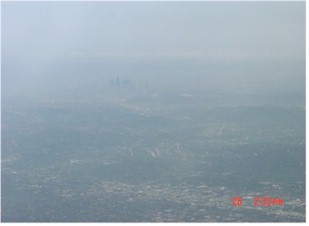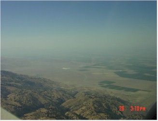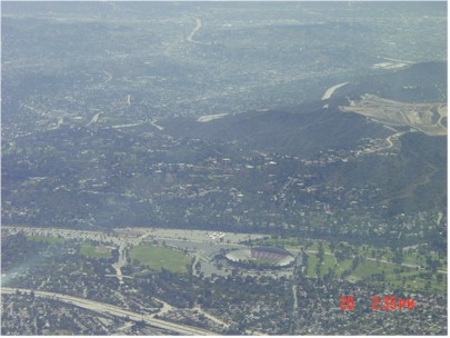 Los Angles sits on the edge of the ocean and is surrounded by fairly tall mountains (there are three mountain peaks in southern California that are over 10,000 ft). These mountains separate Los Angeles from the high desert and the San Joaquin Valley a huge valley that stretches nearly 500 miles up the center of California and is bounded by the Sierras on the east and the coastal mountains on the West. Something like 40% of the nations produce comes out of this valley. It is a spectacular view from the air. Here are some pictures. Not great as it was a bit hazy all day. See "June 26" in the pilot's log. It was a fairly hazy day in Los Angles on Thursday. Downtown Los Angeles is in the distance. Pasadena is at the bottom of the picture. Not much of a shot, but...